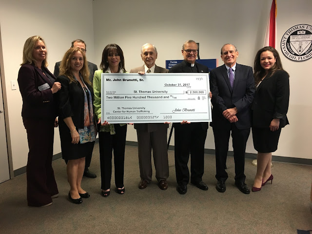 Earlier today, St. Thomas University hosted a joint press conference at the State Attorney’s Office in Downtown Miami announcing John Brunetti’s generous gift of $2.5 million toward our Human Trafficking Academy. The gift will help build on the academy’s success, and exponentially grow its services, which include professional and prevention education, victim and survivor counseling, legal assistance, and education.